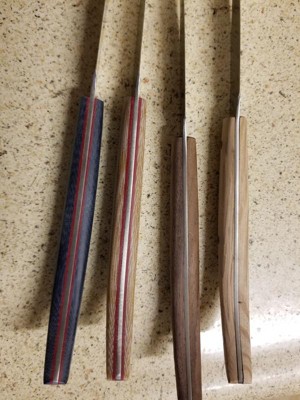 We’ve had the Zwilling Toro steak knife set for a few years now. Great knives. They hold an edge well, comfortable in your hand and beautiful to look at with the colored wood handles. The only issue we have is when you set the knife on the edge of the plate or table (before dinner!), the knife rolls to blade edge up. As long as you you place it, say between the fork tinges. Only complaint, if you want to call it that. Highly recommend.
