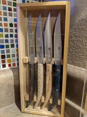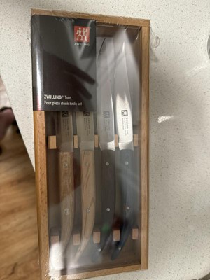 Since 1731, ZWILLING J.A. Henckels has been recognized worldwide as a symbol of quality, innovation and design.Crafted with years of knife-making expertise, ZWILLING Toro Steak Knives are a must for whenever meat is on the menu. They are fabricated from high-quality NITRIUM steel, a nitrogen-rich formula that boasts enhanced cutting power, impressive hardness, and improved cutting-edge durability.The precision-stamped blades ensure exceptional, long-lasting sharpness. From tri-tip to pork chops, these durable blades will effortlessly slice through even the thickest cuts of meat.The unique handles are crafted from reddish-brown palisander wood, tan holm oak, and blue Micarta linen. Appealing to the eye, these multi-colored handles also offer a comfortable, secure grip. Show them off in their handsome wood case, which protects the blades while making this set the perfect gift.