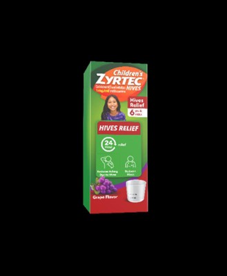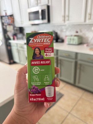Get relief from hives & hive-related itching for your child with Children's Zyrtec Hive Relief liquid in a tasty grape flavor. This oral solution is formulated with five milligrams of cetirizine hydrochloride per 5mL for 24-hour relief of stubborn hives-related symptoms. This antihistamine liquid reduces hives & relieves hive-related itching. Adults & children over the age of six can take 5 milliliters or 10 milliliters of Children’s Zyrtec Hives liquid once a day, depending on the severity of symptoms. Do not exceed more than 10 milliliters in 24 hours. Pack this kid's hive reducer medicine in your backpack or hiking bag to help reduce hives and relieve itching due to hives on the go