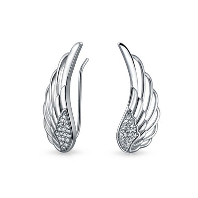 Bling Jewelry Trendy Spiritual Guardian Angel Wing Feather Ear Pin Climbers Earrings Round Cubic Zirconia Pave CZ Crawler Sterling Silver