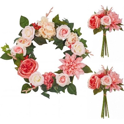 18in Spring Peony Dahlia Wreath Lush Greenery Artificial Flowers Real Rattan Base Includes 2 Matching Bouquets Front Door Home Decor