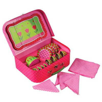 Constructive Playthings Take-Along Tin Tea Set – 20-Piece Kids Tea Party Set with Tray, Teapot & Carry Case for Ages 3+
