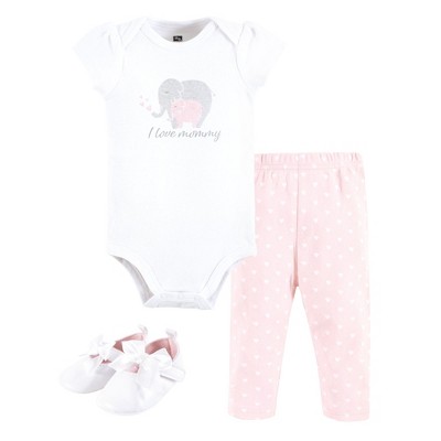 Hudson Baby Infant Girls Cotton Bodysuit, Pant and Shoe Set, Love Mommy Elephant