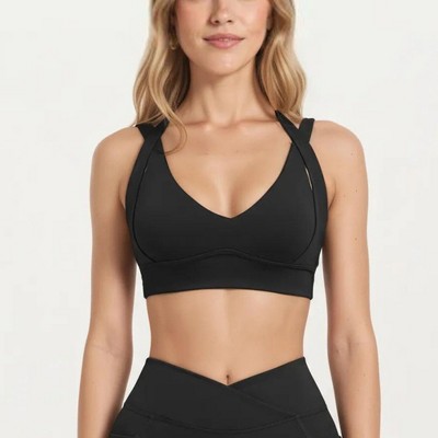 Anna-Kaci Active Women's Ribbed Cross Strap Sports Bra with Double Strap Detail
