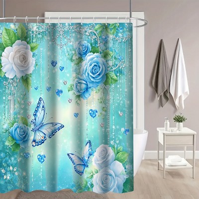 Lomsoe 4PCS Blue Rose & Crystal Butterfly Shower Curtain Set, Elegant Sparkle Print, Perfect for Romantic Bathroom Style