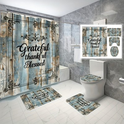 Lomsoe 4PCSVintage Wood Grain Grateful Shower Curtain 4-Piece Set, Rustic Inspirational Print, Waterproof Bathroom Set