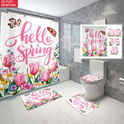 Lomsoe 4PCS Pink Tulip & Hello Spring Logo Shower Curtain Set, Romantic Floral Print, Beautiful for Sweet Bathroom Styling