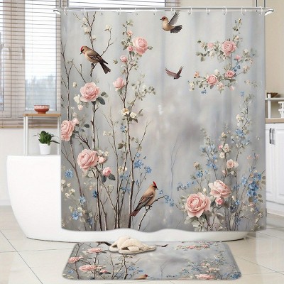 Lomsoe 4PCS Gray Background Watercolor Bird Flower Rose Decorative Shower Curtain Set For Home Bathroom Decor