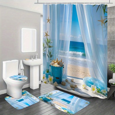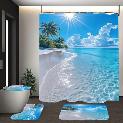 Lomsoe 4PCS Tropical White Sand Beach Shower Curtain Bundle, Bright Coastal Print, Ideal for Fresh Bathroom Decor