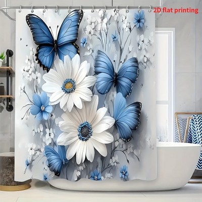 Lomsoe 4PCS 3D Blue Butterfly & White Daisy Shower Curtain Set, Elegant Monochrome Print, Beautiful for Minimalist Bathroom Styling