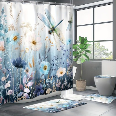 Lomsoe 4PCS Watercolor Dragonfly Wildflower Shower Curtain 4-Piece Set, Fresh Botanical Print, Soft Home Bathroom Set.