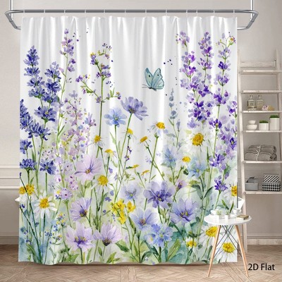 Lomsoe 1PC Watercolor Purple Wildflower Butterfly Shower Curtain, Fresh Botanical Print, Waterproof Fabric for Bathroom