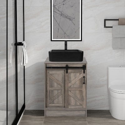 - gray bathroom with brown vanity