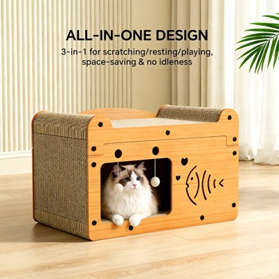 AEELLEEA Durable Cat House Box with Scratching Bed, 3-in-1 Cat Play House with Hideout Caves and Hanging Ball Toys