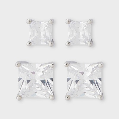 Silver Plated Cubic Zirconia Square Stud Post Earring Set 2pc - A New Day™