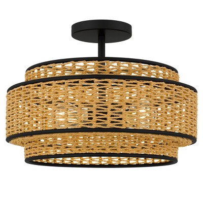 Dewdrop Boho Rattan Semi Flush Mount Ceiling Light 3-Light Black Woven Drum Fixture for Bedroom and Living Room