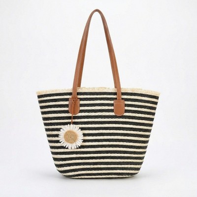 Alilang Women's Striped Woven Tote Bag with Dual Shoulder Straps Frayed Edge Trim and Floral Charm Detail