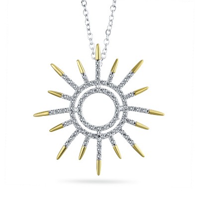 Bling Jewelry Summer Flaming Sunshine Two Tone Micro Pave CZ Starburst Celestial Sunburst Pendant Necklace 14K Gold Brass
