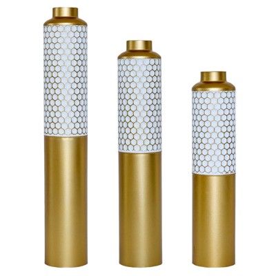NAYSAYE 3-Piece Metal Floor Vases, Hexagonal Pattern Decorative Vases for Farmhouse & Glam Home Decor, Gold and White, 20.27"*7.67"*35.2"