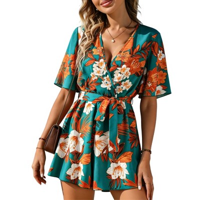 Colorful Floral Wrap V-Neck Short Sleeve Belted Casual Romper Green L