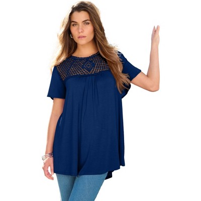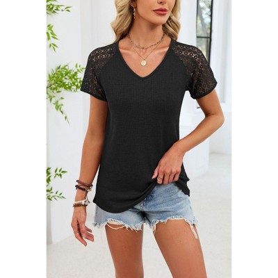 Anna-Kaci Women's Lace Yoke Short Sleeve Blouse with Pleated Front