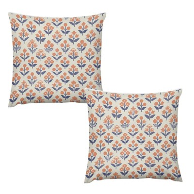 Set of 2 Navy Blue Orange Floral Block Print Pillow Covers, Vintage Outdoor Farmhouse Cushion Cases for Fall Rustic Sofa Couch Bed Decor 18x18 inch