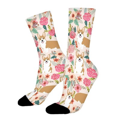 Corgi Florals Pet Dog Women Printed Crew Socks Funny Funky Socks Soft Polyester Novelty Gifts for Artists Men