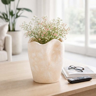 Classic Terracotta Wavy Rim Vase - Decorative Flower Vase - Textured Sculptural Accent for Room, Bedroom, House, and Office - 10", Ivory & Tan
