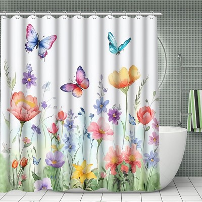 Lomsoe 4PCS Multicolor Butterfly & Floral Shower Curtain Set, Bright Garden Print, Water-Repellent Curtain with Absorbent Mats