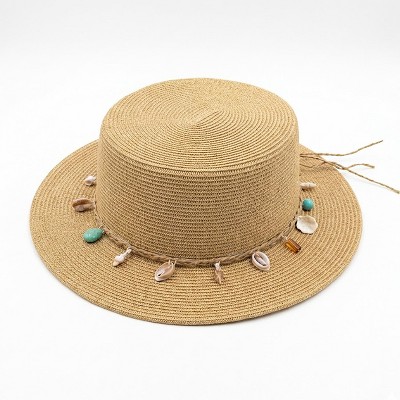 Anna-Kaci Women Straw Boater Hat Wide Brim Summer Sun Hat with Beaded Band Lightweight, Natural Shell Charm