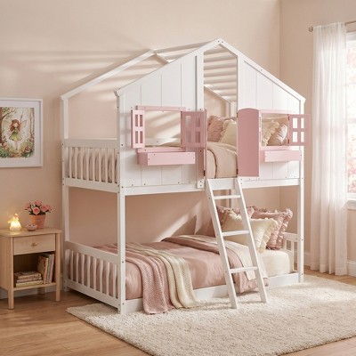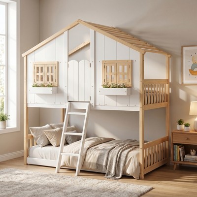 bunk beds in front of windows