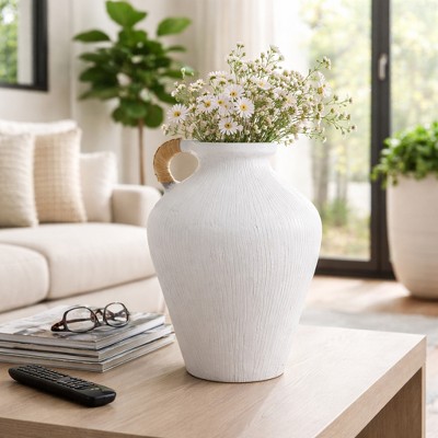 Decorative Textured Terracotta Vase with Rattan Handle for Home Decor - Contemporary Flower Vase for Living Room and Bedroom Decor - 18", White