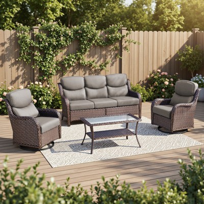 Outdoor Swivel Wicker Glider Patio Chairs with Table, 3 Pieces Outdoor Bistro Set with 4in Thick Cushions and Coffee Table for Porch, Balcony, Deck