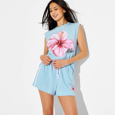 Women's Hibiscus Flower Muscle Graphic Tank Top - Light Blue Floral