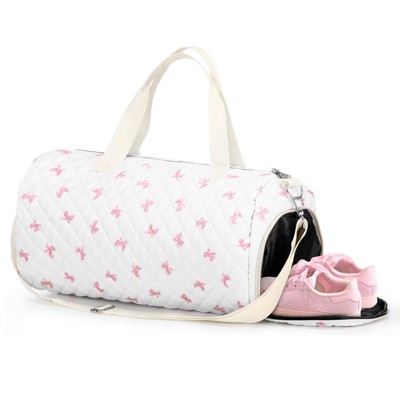 Narwey Quilted Duffle Bag for Women Cotton Pink Bow Dance Bag with Adjustable Carry Strap