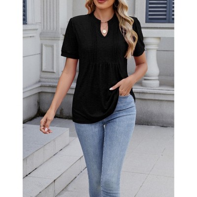 Women's Short Sleeve V Neck T Shirt Pleated Loose Fit Casual Summer Blouses Tops Black XL