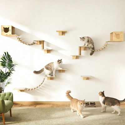Wall Mounted Cat Climber Set with Cat Condos, Scratching Posts, Platforms & Bridges, Vertical Cat Furniture for Indoor Cats, Natural