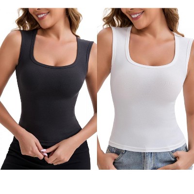 INSPIRE CHIC Women's Wide Straps Square Neck Unpadded Long Airplane Slimming Solid Tank Undershirts 2 Packs