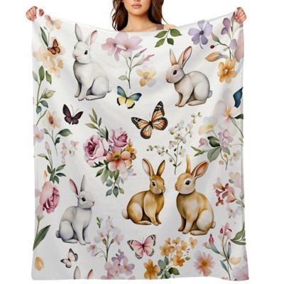 Easter Bunny Throw Blanket,Spring Flowers Blanket for Sofa Bed Couch,Watercolor Floral Rabbit Butterfly Fuzzy Blanket 40x50 inches
