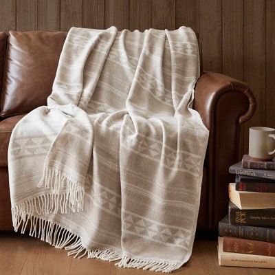 HomeRoots 60" X 50" Beige Woven Cotton Geometric Throw Blanket with Fringe