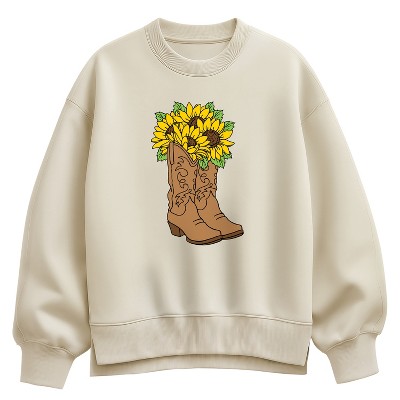 Women's - Instant Message - Cowgirl Boots With Sunflowers Oversized Fleece Crew Sweatshirt