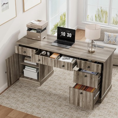 60in Modern Executive Fluted Home Office Desk with Charging Station, File Cabinet & Drawers for Study Living Room Bedroom