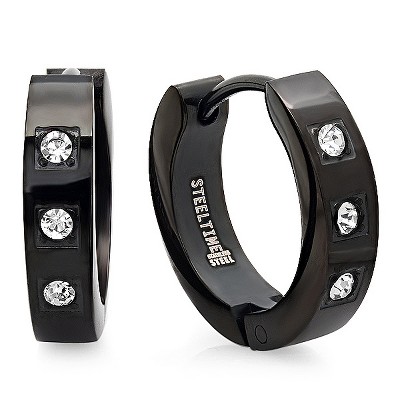 Steeltime Stainless steel huggie earrings black onyx plated with simulated diamonds