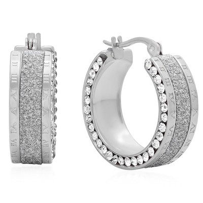 Steeltime Ladies stainless steel hoop earrings with roman numerals and simulated diamonds