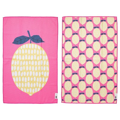 RITZ Waffle Microfiber Kitchen Towel, 2-Pack Set – Lemons – Vibrant Pink & Yellow Citrus Motif Absorbent Dish Cloths 18" x 28" – 80% Recycled