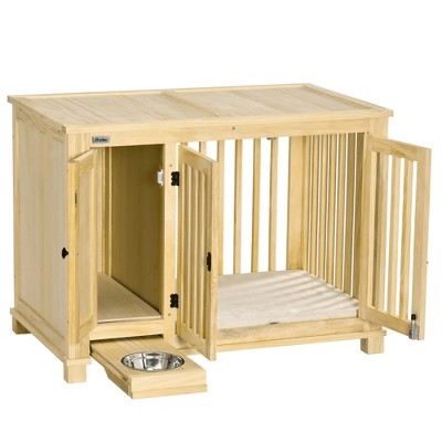 PawHut Small Dog Crate Furniture with Cabinet & Cushion, Wooden Dog Crate End Table with Food Bowl in Drawer, Indoor Dog Kennel Furniture Bed, Natural