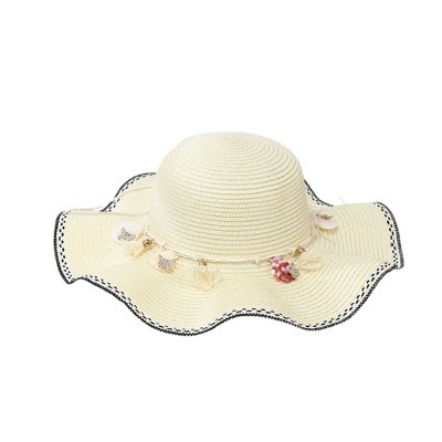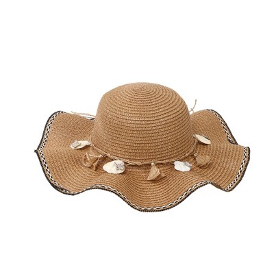 Anna-Kaci Women's Wide Brim Straw Sun Hat Wavy Edge Shell Trim Beach Hat Adjustable Inner Band Packable Hat