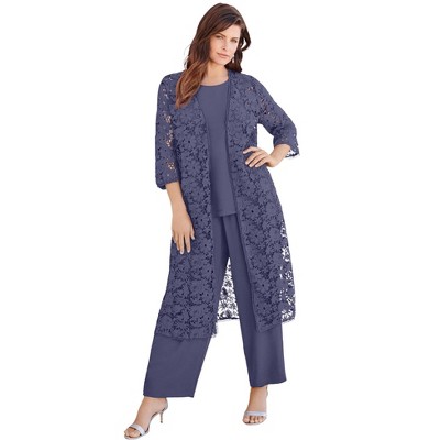 Roaman's Petite Plus Size 3-Piece Allover Lace Duster Pant Set – Formal Wear