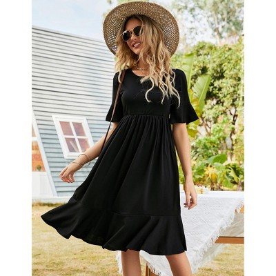 Women's Round Neck Ruffle Dress. Short Sleeve Elastic Waist A Line Midi Dress. Casual Flowy Dress
