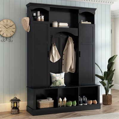 - solid wood hall tree with shoe storage